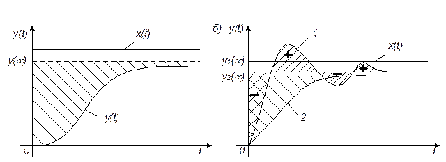 Кожний з розглянутих вище прямих показників якості характеризує лише одну яку-небудь властивість САУ, лише одну ознаку перехідного процесу. Причому, всі показники пов'язані з настроюваними параметрами регулятора складними залежностями, що мають, як правило, суперечливий характер: зміна параметра приводить до поліпшення одних показників якості й погіршенню інших. Ця обставина істотно утрудняє вибір параметрів регулятора. Тому в інженерній практиці широко використовуються інтегральні показники або оцінки якості. Інтегральна оцінка якості – певний інтеграл за часом (у межах від 0 до ¥) від деякої функції керованої величини y(t), або сигналу помилки e(t):