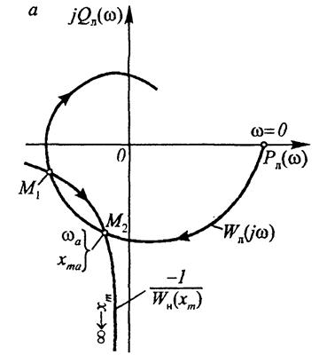 Если линейная часть описывается уравнением высокого порядка или содержит запаздывание, то аналитическое решение системы (16.21) затруднительно или невозможно. В этих случаях автоколебания можно отыскать при помощи критерия Найквиста. Согласно критерия Найквиста, система находится на колебательной границе устойчивости, если АФХ разомкнутого контура проходит через точку