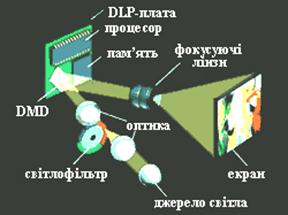 DLP (Digital Light Processing) – цифрова обробка світла. При застосуванні DLP-технології формування зображення відбувається за допомогою цифрового мікродзеркального пристрою DMD. DMD - кристал (матриця) (Digital Micromirror Device) представляє собою кремнієву пластину, на поверхні якої розміщено більше 500 000 керованих мікродзеркал розміром по 16 мікрон кожне і на якому формується зображення. Одне мікродзеркало відповідає одному пікселю. Кожне дзеркало може займати два положення. В одному положенні дзеркало направляє світло в оптичну систему проектора, при цьому вмикається піксель, який відповідає даному дзеркалу. У другому положенні дзеркало направляє світло на світлопоглинач, при цьому піксель, який відповідає даному дзеркалу, вимикається. Світло надходить на дзеркала вже поділеним на основні кольори – червоний, зелений і синій. Використовується по 256 відтінків кожного кольору, які задаються тривалістю експозиції пікселя протягом одного циклу роботи DMD (рис. 11).