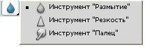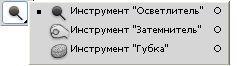 Мал. 4.4. Інструменти з групи Освітлювач У цьому вікні: Dodge (Освітлювач) для освітлення областей і збільшення яскравості зображення; Burn (Затемнювач) для затемнення областей і зменшення яскравості зображення; Sponge (Губка) міняє насиченість (контраст) зображення.