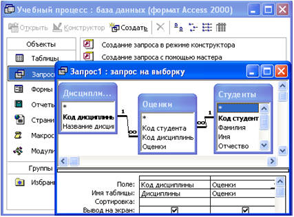 Построить – викликає діалогове вікно, що дозволяє вибрати і запустити построитель Выражений для виділеного поля бланка запиту чи рядкаУсловие отбора. Групповые операции– включає (виключає) у бланк запиту рядокГрупповая операция. Новый объект – відкриває список об'єктів і дозволяє приступити до створення нового об'єкта бази даних: Автоформа, Автоотчет, Таблица, Запрос, Форма, Отчет, Страница, Макрос, Модуль. Набор значений – задає число виведених у режимі таблиці записів в абсолютному чи процентному вираженні. По стрілці в заголовку панелі інструментів конструктора запитів можна викликати список кнопок, що дозволяє додати чи видалити кнопку чи зробити повне настроювання панелі. Для створення запиту треба у вікні База данных перейти на вкладку Запросы і натиснути кнопку Создать. У вікні, що відкрилося, Новый запрос вибрати Конструктор. У Access 2000 можна відразу перейти до створення нового запиту в режимі конструктора, вибравши на вкладці Запросы команду Создание запроса в режиме конструктора. Далі у вікні, щовідкрилося, Добавление таблицы потрібно вибрати використовувані в запиті таблиці і натиснутикнопку Добавить. Для виходу з вікна варто натиснути кнопку Закрыть. У результаті з'явиться вікно конструктора запитів Запрос <номер>: запрос на выборку (рис. 12). Вікно конструктора запитів розділено на дві панелі. Верхня панель містить схему даних запиту, що включає обрані для даного запиту таблиці. Таблиці представлені списками полів. Нижня панель є бланком запиту QBE, який потрібно заповнити. У вікні конструктора запиту відображаються обрані таблиці зі списком полів і одно-багатозначні зв'язки між ними, що є в схемі даних бази. Перший рядок у списку полів, відзначений зірочкою *, позначає всю безліч полів таблиці. Крім того, Access автоматично встановлює зв'язки для об'єднання таблиць, якщо таблиці мають поля з однаковими іменами і типами даних, навіть якщо зв'язки не були встановлені в схемі даних. Зв'язки-об'єднання, що не були встановлені Access автоматично, може установити користувач, перетягнувши задіяні в зв'язку поля з одного списку полів в іншій. При використанні в запиті інших запитів чи таблиць, не представлених у схемі даних бази, з ними також можуть бути встановлені зв'язки об'єднання.
