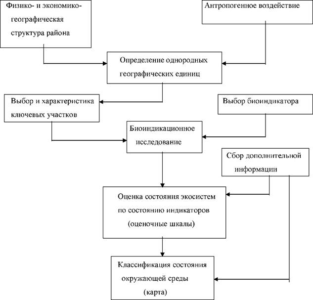 По-третє: вибір індикаторів і біоіндикаційні дослідження обраних індикаторів, проводяться протягом трьох років, три рази на рік - навесні, влітку і восени, щоб виявити не тільки стан індикаторів, але й динаміку їх змін. По-четверте: збір додаткової інформації про стан ґрунту, води і господарської діяльності людини. По-п'яте: оцінка стану навколишнього середовища, яке має два етапи: 1) виявлення основних кількісних співвідношень між станом індикаторів і станом екосистем; побудова оцінних шкал; 2) екстраполяція станів екосистем на більш великі однорідні географічні одиниці. Побудова карти стану навколишнього середовища. Біоіндикаційні спостереження ведуться на двох системних рівнях - популяції та індивіда. Для кожного рівня розроблені критерії для вибору індикаторів та індикаційних ознак. Ступінь зміни екосистем відбивається екологічними індексами цих пологів. Особливо показовий індекс різноманітності спільноти Н '(індекс Шеннона), де високе значення свідчить про високу міру стабільності і саморегуляції екосистеми: