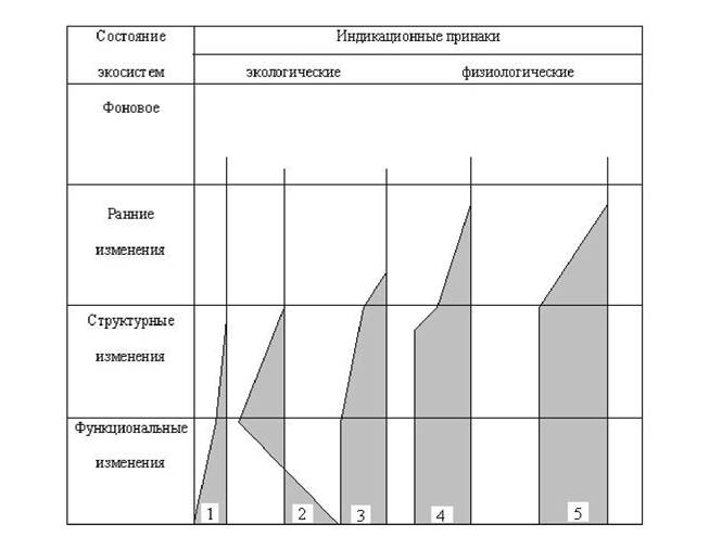 Малюнок - Модель оцінної шкали 1 - кількість видів; 2 - чисельність; 3 - біомаса; 4 - вага органів; 5 - активність ферментів Різке відхилення фізіологічних індикаційних ознак і майже фонове значення екологічних свідчать про порушення екосистем на ранніх стадіях. На стадії структурного порушення екосистем екологічні та фізіологічні ознаки досягають майже однакових відхилень і вони пропорційні. Про функціональне порушення екосистем свідчить перевищення відхилень екологічних ознак над фізіологічними. На цьому етапі фізіологічні ознаки вже не змінюються, більш якісна оцінка виходить за рахунок екологічних ознак. Комбінацією різних фіто-і зооіндикаторів на двох системних рівнях можна оцінити поступові і дуже незначні зміни в стані екосистем. І при чіткому наборі характерних для досліджуваної території ключових ділянок можна оцінити і більш великі географічні одиниці і скласти карту стану навколишнього середовища. На основі карти і оціночних шкал можна в майбутньому дуже швидко оцінити стан будь-якої екосистеми відповідного типу даного регіону або при наявності фонових екосистем та інших регіонів і дати рекомендації про оптимальну господарську діяльність на даній території.