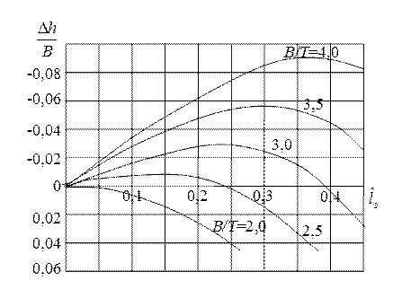 Результати розрахунків за формулою (3.7) виконані стосовно судна, у якого d = 0,65, a = 0,75 і Очевидно, що для судна з іншими значеннями вихідних величин отримані графічні залежності будуть мати інші чисельні значення, але характер їх не зміниться. Це дозволяє зробити наступні загальні висновки: - при збільшенні відношення В/Т інтенсивніше погіршується остійність аварійного судна; - висхідні гілки кривих - у дуже вузьких суден В/Т = 2,0...2,1 аварійна остійність може збільшитись.
