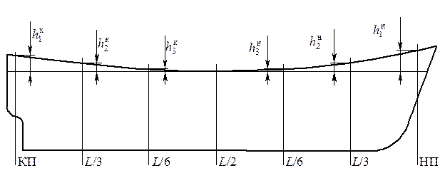 де – відрахування на надбудови. Якщо розрахункова довжина надбудови дорівнює L, то необхідно відрахувати від базисного надводного борту величину N, яка дорівнює: 350 мм (довжина судна L = 24 м); 860 мм (довжина судна L = 85 м); 1070 мм (довжина судна L ³ 122 м). Проміжні значення відрахувань в залежності від довжини судна визначаються лінійною інтерполяцією. Якщо загальна довжина надбудов менше L, то відсоток відрахування визначається за таблицями Правил окремо для суден типу А і типу В залежно від типу і довжини надбудов: k 3 = Nf (L надбуд). Правила Регістру пред’являють вимоги до сідлуватості верхньої палуби. Відсутність сідлуватості повинна компенсуватися підвищенням висоти надводного борту. Форма стандартного профілю сідлуватості задається квадратичною параболою з нульовою аплікатою на міделі (рис. 6.10). Ординати стандартного профілю сідлуватості наведені в табл.6.8, яка одночасно є розрахунковою для визначення надлишку або нестачі сідлуватості в носовій і кормовій половинах для проекту судна. Якщо профіль сідлуватості відрізняється від стандартного, то 4 ординати носової і кормової половин профілю повинні помножуватися на відповідні коефіцієнти. Таблиця 6.8. Таблиця розрахунку стандартних ординат і розрахунку надлишку або недостатку сідлуватості.