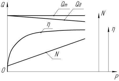 Для ЗПН всі ККД визначаються експериментально. При розрахунковому навантаженні величина загального ККД залежить від конструкції, стану, якості виготовлення вузлів і деталей та розмірів насоса. В середньому для вальних ЗПН Залежність подачі, потужності і ККД від тиску називається характеристикою об’ємного насоса (рис.3.11). Зниження подачі