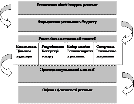 Найпопулярнішою і широко використовуваною складовою системи маркетингових комунікацій є реклама. На сучасних насичених товарних ринках витрати на рекламу зростають, причому вони ні в якому разі не повинні бути компенсацією низької якості товарів. Відомий американський рекламіст Альфред Політц сформулював це у вигляді закону рекламної практики: «Реклама стимулює продаж.хорошого товару і прискорює провал поганого. Вона показує, яких якостей продукт не має і допомагає споживачеві скоро це збагнути». Планування рекламної діяльності підприємства потребує прийняття різних рішень, основні з яких схематично зображено на рис. 8.4.