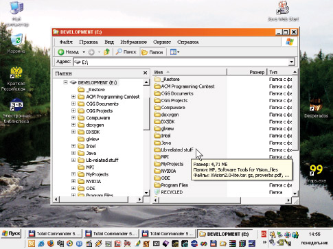 Рис. 2.9. Графічний інтерфейс ОС Windows XP. Типові функції такого інтерфейсу містять у собі саме операції бліттинга й растеризації примітивів, а також роботу з палітрами, хоча зараз палітри вже майже не використовуються. В UNIX-Подібних ОС графічний інтерфейс надається системою X Windows, що працює за принципом " клієнт-сервер". Програма-Клієнт відправляє який-небудь запит API по мережі (хоча для самої програми це виглядає як просто виклик функції); одержавши цей запит, програма-сервер відповідає за його виконання. Хоча така схема і є гнучкою (можна, наприклад, мати кілька дисплеїв в одного комп'ютера або, навпаки, багато комп'ютерів, підключених до одного дисплея), але в той же час вона вимагає й додаткових витрат на передачу даних по мережному протоколі. Насправді, у ПК не використовується ця гнучкість, а всі запити передаються в рамках однієї системи (через поділювану між процесами клієнта й сервера пам'ять).