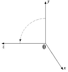 Рис. 4.8. Поворот у просторі У випадку тривимірного простору міркування, що стосуються переносу й масштабування, повністю аналогічні, тільки вони поширюються на третю координату крапок. З обертанням же інша справа, оскільки тут обертовий рух є переміщення уздовж поверхні сфери й поворот на якийсь кут щодо крапки не можна визначити однозначно. Але переміщення з однієї крапки сфери в іншу завжди можна здійснити послідовністю поворотів щодо осей координат, тому виведемо формули для цих трьох обертань. При повороті щодо осі