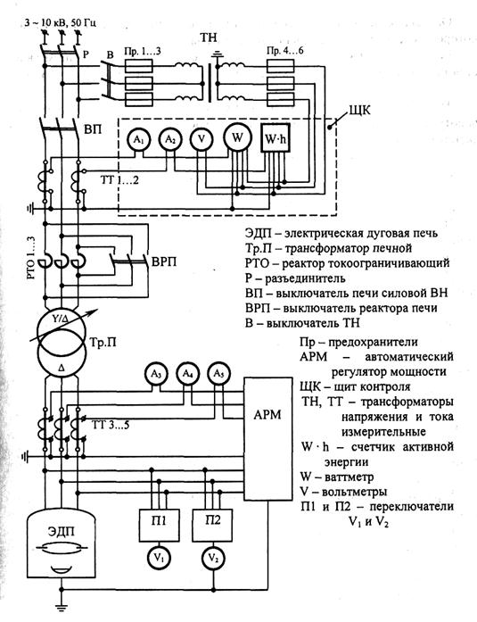 К основному электрооборудование ДСП относят: - печь с электродами и ванной; - понизительный трансформатор; - дроссели; - короткую сеть; - коммутационную, измерительную и защитную аппаратуру. Принципиальная электрическая схема показана на рис. 4.4. Первичная цепь печи состоит из последовательно соединенных проводов и аппаратов высокого напряжения, дросселя и первичной обмотки трансформатора. Вторичная цепь состоит из последовательно соединенных вторичной обмотки трансформатора, токопроводов короткой сети, соединяющих вторичные выводы трансформатора с электродами печи; электродов и электрических дуг. Электроснабжение трансформаторов печной подстанции производится от сети 6(10)-35 кВ, а для мощных подстанций - 110 кВ. Цепи измерения и защиты подключены к трансформаторам тока и напряжения. Для поддержания оптимального режима печи устанавливаются автоматические регуляторы мощности печи. Такие регуляторы воздействуют на механизм передвижения электродов, изменяют длину дуги и поддерживают заданное значение мощности дуговой печи. Для повышения точности регулирования созданы автоматизированные системы управления ДСП. Печные трансформаторы для печей небольшой и средней мощности выполняют трехфазными. Для печей большой мощности применяются группы однофазных трансформаторов, которые позволяют получить повышенный коэффициент мощности за счет более рациональной конструкции короткой сети и независимого регулирования мощности и напряжения каждой фазы. Печные трансформаторы имеют следующие особенности: - высокое значение номинального тока на стороне низкого напряжения (до десятков и сотен килоампер); - большой коэффициент трансформации; - число ступеней и диапазон регулирования напряжения гораздо больше, чем у силовых трансформаторов (напряжение регулируется примерно на 500%); - трансформаторы обладают высокой стойкостью против эксплуатационных коротких замыканий с кратностью тока (2,5–3)IН, имеют высокую механическую прочность. Мощные печные трансформаторы имеют принудительное охлаждение с искусственной циркуляцией масла через теплообменник, снабжены устройствами РПН, производящими до 160 переключений в сутки. Обмотки трехфазных трансформаторов соединяются по схеме «треугольник-треугольник» с возможностью переключения по схеме «треугольник – звезда», что позволяет переводить печь с линейного напряжения на фазное. Регулирование напряжения на электродах печи и ее электрических характеристик осуществляется с помощью устройства ПБВ или РПН. Переключение без возбуждения применяется на печных трансформаторах малой и средней мощности. В трансформаторах большой мощности переключение осуществляется под нагрузкой, для чего трансформатор снабжается автоматическим регулятором напряжения. Дроссель, или реактор служит для ограничения бросков тока при эксплуатационных коротких замыканиях и стабилизации горения дуг за счет создания падающей характеристики цепи питания. У работающих непрерывно дуговых печей режим работы дросселя прерывистый, условия его работы тяжелые, поэтому он должен удовлетворять повышенным требованиям термической и механической прочности. Дроссель включается между сетью и линейными зажимами обмотки высокого напряжения трансформатора или в «фазу» – последовательно с данной обмоткой. Чаще 