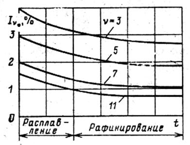 Колебания нагрузки ДСП, особенно колебания реактивной мощности, вызывают значительные колебания напряжения в питающей сети, которые тем больше, чем больше мощность печного трансформатора и меньше мощность короткого замыкания в точке присоединения дуговой печи. Несимметрия токов и напряжений. По осциллограммам видно, что нагрузка по фазам сети неравномерна. Максимальное различие по фазам А и С составляет: по активной мощности 9 МВт, по реактивной мощности - 8 Мвар (табл. 4.3). Несинусоидальность токов и напряжений. Дуга и печной транс-форматор имеют нелинейные вольтамперные характеристики. По отношению к внешней сети ДСП является источником высших гармонических составляющих и генерирует в сеть 3, 5, 7, 11 и т.п. гармоники. На рис. 4.7 приведены кривые изменения токов гармоник для ДСП емкостью от 25 до 100т. Таблица 4.3
