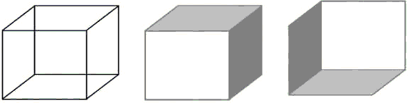 Рис. 8.1. Неоднозначність сприйняття зображення куба Складність завдання видалення невидимих ліній і поверхонь привела до появи великої кількості різних способів її рішення. Багато хто з них орієнтовані на спеціалізовані додатки. Єдиного (загального) рішення цього завдання, придатного для різних випадків, природно, не існує: для кожного випадку вибирається найбільш підходящий метод. Наприклад, для моделювання процесів у реальному часі потрібні швидкі алгоритми, у той час як для формування складного реалістичного зображення, у якому представлені тіні, прозорість і фактура, що враховують ефекти відбиття й переломлення кольору в дрібних відтінках, фактор часу виконання вже не так существенен. Подібні алгоритми працюють повільно, і найчастіше на обчислення потрібно кілька мінут або навіть годин. Існує тісний взаємозв'язок між швидкістю роботи алгоритму й детальністю його результату. Жоден з алгоритмів не може досягти гарних оцінок для цих двох показників одночасно. У міру створення усе більше швидких алгоритмів можна будувати усе більше детальні зображення. Реальні завдання, однак, завжди будуть вимагати обліку ще більшої кількості деталей. Всі алгоритми такого роду так чи інакше містять у собі сортування, причому головне сортування ведеться по геометричній відстані від тіла, поверхні, ребра або крапки до крапки спостереження або картинної площини. Основна ідея, покладена в основу сортування по відстані, полягає в тім, що чим далі розташовано об'єкт від крапки спостереження, тим більше ймовірність, що він буде повністю або частково закритий одним з об'єктів, більше близьких до крапки спостереження. Після визначення відстаней або пріоритетів по глибині залишається провести сортування по горизонталі й по вертикалі, щоб з'ясувати, чи буде розглянутий об'єкт дійсно закритий об'єктом, розташованим ближче до крапки спостереження. Ефективність будь-якого алгоритму видалення значною мірою залежить від ефективності процесу сортування. Алгоритми видалення невидимих ліній або поверхонь можна класифікувати по способі вибору системи координат або простору, у якому вони працюють. Алгоритми, що працюють в об'єктному просторі, мають справа зі світовою системою координат, у якій описані ці об'єкти. При цьому виходять досить точні результати, обмежені, загалом кажучи, лише погрішністю обчислень. Отримані зображення можна вільно масштабувати. Алгоритми, що працюють в об'єктному просторі, особливо корисні в тих додатках, де необхідна висока точність. Алгоритми ж, що працюють у просторі зображення, мають справа із системою координат того екрана, на якому об'єкти визуализируются. При цьому точність обчислень обмежена розв'язною здатністю екрана. Ми приведемо деякі з алгоритмів, що працюють як в об'єктному просторі, так і в просторі зображення, кожний з яких ілюструє одну або кілька основних ідей теорії алгоритмів видалення невидимих ліній і поверхонь.