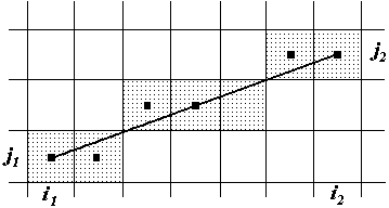 Рис. 10.1. Растровий образ відрізка У більшості алгоритмів використовується покроковий метод зображення, тобто для знаходження координат чергової крапки растрового образа наращивается значення однієї з координат на одиницю растра й обчислюється збільшення іншої координати. Завдання полягає в побудові відрізка, що з'єднує на екрані крапки з координатами
