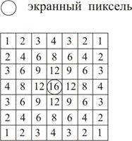 Рис. 11.10. Розподіл ваг при збільшенні дозволу в 16 разів Для запобігання сильних перекручувань у цьому випадку можна, в- перших, підвищувати дозвіл растра, що дозволяє відображати усе більше дрібні деталі об'єктів. Але в цього підходу є свої чисто фізичні обмеження. Другий підхід полягає в тім, що растр розраховується з більше високим дозволом, а зображується з більше низьким - шляхом усереднення атрибутів пикселей першого більше детального растра з певними вагами. Якщо ваги однакові, то ми одержуємо рівномірне усереднення, як показано на мал. 11.9. Кращих результатів можна досягти, якщо використовувати різні ваги в пикселей першого растра. На мал. 11.10 показаний розподіл ваг при деталізації пикселя екранного растра. Інший метод усунення ступінчастості полягає в тому, щоб розглядати пиксель не як крапку, а як деяку кінцеву область. В алгоритмах побудови растрового розгорнення пиксель уважається приналежної області зафарбовування, якщо його центр перебував усередині ідеального образа області. Якщо малюнок чорно^-білий, то усунути ефект ступінчастості растра практично неможливо. Але при наявності відтінків півтонів можна задати інтенсивність кольору пикселя залежно від площі його перетинання з областю. Розглянемо застосування цього методу на прикладі розфарбування багатокутника. Ребро багатокутника будується з використанням алгоритму Брезенхема, описаного в лекции 8. Тут у цей алгоритм будуть внесені зміни, що включають параметр максимального числа рівнів интенсивностей. Визначаючи приналежність пикселя багатокутнику, ми будемо використовувати як помилка e частку площі, що належить ідеальній фігурі (мал. 11.11).