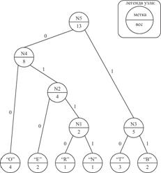2. Побудуємо дерево Хаффмена (см. рис. 13.1): - проинициализируем дерево термінальними вузлами, - створимо батьківський вузол N1 для вузлів елементів "N" і "R" з вагою 2; - створимо батьківський вузол N2 для вузла елемента "E" і вузла N1 з вагою 4; - створимо батьківський вузол N3 для вузлів елементів "Т" і "B" з вагою 5; - створимо батьківський вузол N4 для вузла елемента "O" і вузла N2 з вагою 8; - створимо батьківський вузол N5 для вузлів N3 і N4 c вагою 13. 3. Проведемо кодування. Складемо для зручності таблицю кодів: