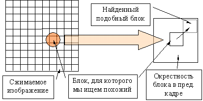 Найпростіший спосіб ураховувати подобу сусідніх кадрів - це віднімати кожний блок стисливого кадру з відповідного блоку попереднього. Однак більше гнучким є алгоритм пошуку векторів, на які зрушилися блоки поточного кадру стосовно попередній. Для кожного блоку в зображенні ми знаходимо блок близький по деякій метриці (наприклад, по сумі квадратів різниці пикселей) у попередньому кадрі в деякій околиці поточного положення блоку. Якщо мінімальна відстань по обраній метриці із блоками в попередньому кадрі більше обраного порога - блок стискується незалежно (мал. 15.2).