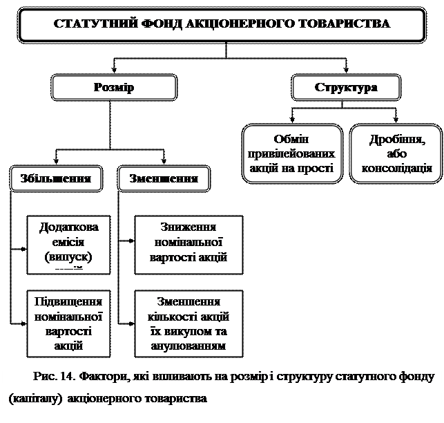 Необхідно усвідомити, по-перше, призначення звіту — розкрити структуру власного капіталу і причини (фактори), під впливом яких відбулися зміни у структурі і розмірі власного капіталу. Для унаочнення факторів, які впливають на розмір і структуру статутного капіталу найбільш поширених видів господарських товариств (акціонерного товариства і товариства з обмеженою відповідальністю) наводяться відповідні схеми (рис. 13 і 14).