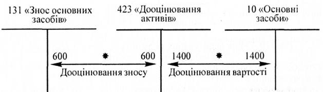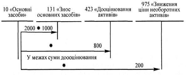 Рис. 16. Зниження ціни раніше дооцінених основних засобів Уцінка основних засобів списується на витрати діяльності, але у певних випадках, зокрема, якщо уцінці підлягають раніше дооцінені об’єкти, частина уцінки спрямовується на зменшення додаткового капіталу. Такі нюанси відбиття дооцінювання та зниження ціни можна простежити за схемою, наведеною на рис. 17.
