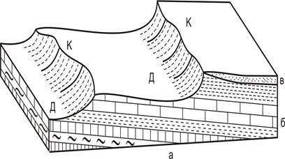 Рисунок 5.2 - Монокліналь, куести (К) і моноклінальні долини (Д);а,б,в – більш стійкі породи товщі