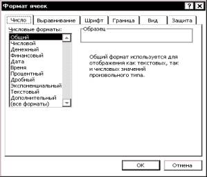Вікно діалогу «Формат ячеек» складається з шести вкладок: Вкладка «Число» дозволяє вибрати один із вбудованих або створених користувачем форматів, а також створити новий числовий формат. Вкладка «Выравнивание» дозволяє визначити горизонтальне та вертикальне вирівнювання, орієнтацію вмісту клітинки, а також представити текст у декількох рядках. Вкладка «Шрифт» дає можливість вибрати вид і розмір шрифту, а також задати інші параметри, що визначають, наприклад, колір, підкреслення та деякі інші ефекти. Вкладка «Граница» дозволяє додати до окремих клітинок або діапазонів клітинок рамку, а також визначити стиль та колір лінії рамки. Вкладка «Вид» дозволяє вибрати візерунок і його колір, а також колір заливки. Вкладка «Защита» дозволяє задати режим захисту клітинки та приховання формул. Визначивши на вказаних вкладках потрібні параметри форматування, закрийте вікно діалогу, натиснувши кнопку «ОК». Після цього ви отримаєте відображення вмісту клітинок із врахуванням заданих параметрів. Найбільш важливі та часто вживані параметри форматування можна задати і за допомогою кнопок панелі інструментів «Форматирование».