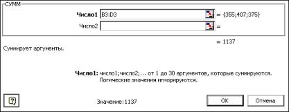 6. Уведіть потрібні аргументи, використовуючи будь-який з розглянутих способів. При необхідності перемістіть вікно, щоб воно не заважало уведенню аргументів. Поточний результат обчислення функції буде поданий у полі «Значение». 7. Натисніть кнопку «ОК». Excel вставить функцію у поточну клітинку. У самій клітинці буде відображений результат обчислення функції. Якщо, знаходячись у першому вікні майстра функцій, натиснути кнопку «ОК», Excel вставить функцію з шаблонами для завдання аргументів. За допомогою майстра функцій можна також вкласти функції одна в одну, тобто використовувати як аргумент даної функції іншу функцію. Для цього при введенні аргументу зовнішної функції клацніть на кнопці Якщо в якості аргументу функції повинно бути вказано ім'я діапазону клітинок, виберіть його зі списку у полі імен рядка формул. Для уведення функції, що дозволяє швидко визначити суму вмісту діапазону клітинок, є спеціальна кнопка За допомогою майстра функцій потім можна змінити аргументи будь-якої функції. Для внесення змін: 1. Виділіть клітинку з функцією, що необхідно змінити. 2. Запустіть майстер функцій. Excel відобразить на екрані друге вікно майстра функцій, що дозволить змінити аргументи функції. 3. Виконайте необхідні зміни. 4. Натисніть кнопку «ОК» або клавішу < Enter >. Якщо активна клітинка містить більше однієї функції, спочатку вкажіть у рядку формул відповідний аргумент. Щоб задати відображення у клітинках робочого листа самих формул замість результатів, встановіть прапорець параметра «Формулы» на вкладці «Вид» вікна діалогу «Параметры», що викликається командою «Сервис\Параметры…». Задане значення параметра дійсне тільки для поточного робочого листа. Повернутися до відображення результатів можна, скинувши вказаний прапорець.