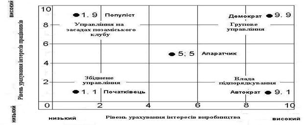 8.3. Важливе значення поведінкового підходу полягає в тому, що він допоміг провести аналіз і скласти класифікацію стилів керівництва. Стиль керівництва - це звична манера поведінки керівника по відношенню до підлеглих, спонукає їх до досягнення цілей організації. Стиль керівництва, який характеризує даного лідера, залежить від обсягу делегування повноважень, використовуваних типів влади, турботи про людські стосунки і виконання завдань організації. Головними у структурі стилю керівництва вважали такі елементи: - спосіб прийняття рішення; - спосіб розділу функцій у розв’язанні завдань; - форми контролю; - оцінювання виконання рішень; - розподіл відповідальності. Розглянемо характеристики основних стилів керівництва. Авторитарне керівництво базується на тому, що керівник має достатню владу, щоб нав’язати свою волю виконавцям. Відомий дослідник Дуглас МакГрегор положення про авторитарне керівництво назвав “теорією Х”, згідно з якою: а) люди спочатку не люблять працювати і за будь-якої можливості уникають роботи; б) у людей відсутнє честолюбство, і вони намагаються уникнути відповідальності, згідні на те, щоб ними керували; в) понад усе люди хочуть бути захищеними; г) щоб примусити людей працювати, слід використовувати примус, контроль, погрози. Автократичний тип керівника відрізняється схильністю до єдиноначальності, надмірною централізацією влади, особистим вирішенням всіх питань, свідомими обмеженнями всіх контактів з підлеглими. Керівник автократичного типу догматичний, прагне підпорядковувати весь колектив своїй волі, не виносить заперечень і не прислухається до думки інших, часто втручається в роботу підлеглих і жорстко контролює їх дії. Наради проводить лише для дотримання формальності, оскільки рішення у нього підготовлені заздалегідь. Критики і своїх помилок не визнає, однак сам любить покритикувати. Дотримується думки, що адміністративні стягнення найкращий засіб впливу на підлеглих. В цілому для керівника – автократа характерна недостатня повага до підлеглих. Не слід путати з автократичним типом керівника, який досить часто діє згідно плану, реалізуючи його, долаючи будь – які перешкоди. У цьому випадку він може бути жорстким, безкомпромісним, але справедливим, владним, таким, що не пригнічує ініціативу інших, рішучим, але не самовпевненим. Нерідко авторитарність служить маскуванням некомпетентності керівника або відсутності у нього організаторських здібностей. Нині, при зростаючій ролі суб’єктивного фактора й інтелекту працівників, жорсткий автократичний керівник стає неприйнятним. Демократичний тип керівника прагне до надання підлеглим самостійності, залучає їх до таких видів діяльності, як визначення цілей, оцінки роботи, підготовки та прийняття рішень, створює необхідні для виконання передумови, з повагою ставиться до людей і турбується про них. Демократичне керівництво апелює до потреб більш високого рівня, а саме до потреб у причетності, високих цілях, автономії і самовираженості (“теорія Y”) за якою: а) якщо умови праці прийнятні, то люди візьмуть на себе відповідальність і будуть до неї прагнути; б) якщо люди причетні до цілей організації, то вони будуть використовувати самоуправління і самоконтроль; в) залучення є функцією винагороди, спрямованої на досягнення цілі; г) здібність до тв