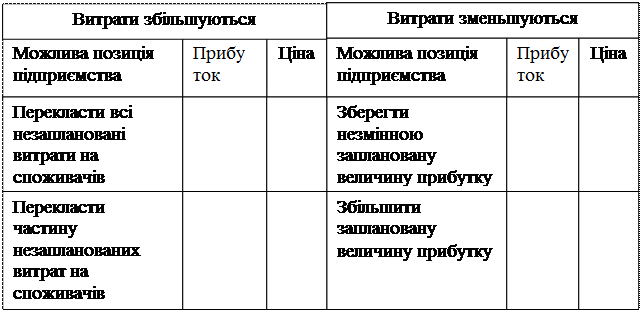 де Сгал – середньогалузева собівартість продукції; Сі - собівартість продукції на і-тому підприємстві; Qi - обсяг виробництва продукції на і-тому підприємстві в натуральних вимірниках; n – кількість підприємств, що займаються виробництвом продукції. Порівнюючи власний рівень витрат Сінд із Сгал підприємство вирішує питання доцільності своєї діяльності на даному ринку. Крім того, підприємству слід визначатися з ціновою політикою на випадок зміни витрат (табл. 10.1). Таблиця 10.1 Цінова політика підприємства
