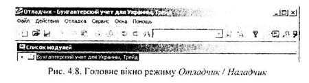Наладчик — це допоміжний зовнішній засіб, за допомогою якого здійснюється настроювання (з рос. — отладка) програмних модулів, створених в режимі конфігурування. У цьому режимі (рис. 4.8) виконуються такі процедури: - покрокове виконання модуля; - розставляння точок зупинок виконання модуля; - переривання і продовження виконання модуля; - налаштування кількох модулів одночасно; - перегляд гілки викликів процедур і функцій; - заміри продуктивності. Таким чином, робота в системі здійснюється в режимі Користувач — ПОЕМ і починається з виклику (запуску) того чи того режиму.