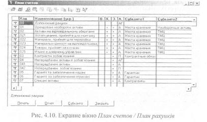 Для перегляду чи вибору балансового рахунка план рахунків завжди подається у вигляді таблиці. У лівому стовпці такої таблиці (рис. 4.10) виводиться код рахунка, потім — його назва, далі — ознаки валютного і кількісного обліку, службові ознаки (напр., вид рахунка), назви видів субконто і, нарешті, стовпці для додаткових реквізитів стовпців. Коригувати конкретний балансовий рахунок в плані рахунків — змінювати його назву, встановлювати значення різних ознак і т. ін. — можна в два способи: - безпосередньо у чарунках плану рахунків; - у спеціально створеному діалозі. Поточний план рахунків можна роздрукувати за допомогою кнопки Друк екранної форми плану рахунків. Для створення плану рахунків як засобу організації господарського обліку в компоненті використовується об'єкт метаданих Бухгалтерські рахунки (Рахунки). Основне призначення цього об'єкта метаданих — формування довідників з планами рахунків бухгалтерського обліку. Його структура (довжина коду, кількість рівнів субрахунків, а також кількість знаків у субрахунку кожного рівня) визначається на етапі конфігурування і задається у вигляді шаблона, який складається з послідовності символів «#» та «<... >». Код балансового рахунка в загальному випадку — це символьний рядок такого вигляду: < код рахунка >.< код субрахунка >.< код субрахунка >... Наприклад, структура повного коду рахунка, що задана, як «##. #. ###» розшифровується так: - рахунок першого рівня може мати код не більше двох сим - за рахунком першого рівня можна відкрити два рівні субра - код субрахунка першого рівня має довжину один символ; - код субрахунка другого рівня має довжину до трьох символів. Отже, шаблон рахунка опосередковано задає загальну кількість рівнів субрахунків, яка може бути в плані рахунків, і загальну кількість субрахунків, яка може бути у рахунку чи субрахунку. На етапі конфігурування описуються також додаткові реквізити, які характеризують окремі рахунки, форми перегляду їх списку і методи коригування. Згідно із структурою плану рахунків в системі «1С: Підприємство» автоматично організується система збереження бухгалтерських підсумків. Підсумкова інформація вилучається засобами вмонтованої об'єктно-орієнтованої мови. Залишки та обороти засобів можна отримати за кожним рахунком або субрахунком в цілому чи за об'єктами аналітичного обліку у вартісному і кількісному вимірі.