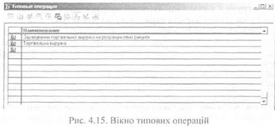 При формуванні проведення виконуються певні дії, які полегшують і прискорюють роботу користувача. Наприклад, під час заповнення документа автоматично відкриваються довідники; переносяться облікові дані з одного документа в інший; якщо введено кількість, автоматично визначається вартість, і т. ін. У разі потреби користувач може «відключати» проведення, а потім знову «включати» їх. «Відключені» проведення не впливають на бухгалтерські підсумки. (Це дуже зручно, наприклад, для введення операцій, які здійснюватимуться в майбутньому.) Для швидкого введення інформації (другий етап функціонування інформаційної системи) призначено механізм типових операцій. Типові операції (рис. 4.15) — це сценарії формування проведень для господарських операцій, які здійснюються на об'єкті управління регулярно.