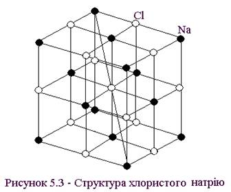 Структура хлористого натрію (рис. 5.3). Решітка – кубічна, гранецентрована. Аналогічну структуру мають кристали KBr, RbJ, PbS, AgBr, MgO.
