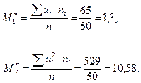 1. В перший стовпець таблиці записують вибіркові варіанти (середини інтервалів), розташовуючи їх у порядку зростання. 2. У другий стовпець записують відповідні частоти варіант. 3. В третій стовпець записують умовні варіанти 4. В четвертий стовпець записують добуток умовних варіант і відповідних частот, обчислюють 5. У п’ятий стовпець записують добуток квадратів умовних варіант і знаходять 6. Обчислюють умовні моменти