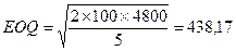 Розрахунки показують, що другий варіант є більш привабливим. Знижки з ціни залежно від обсягу закупівель. Знижки з ціни залежно від обсягу закупівель розширюють формулу економічного розміру замовлення так само, як знижки на транспортні тарифи, які визначаються обсягом вантажоперевезень. Включення знижок у базову модель EOQ зводиться до розрахунку сукупних витрат і відповідного економічного розміру замовлення для кожного обсягу (і ціни) закупівлі. Якщо за певного обсягу закупівлі знижка буде достатньою, щоб компенсувати зростання витрат на утримання запасів за винятком скорочення витрат на розміщення замовлень, такий варіант, можливо, виявиться вигідним. Підприємство закуповує деталі за ціною 25 грн. за одиницю, річна іотреба в деталях складає 4800 шт., витрати на зберігання однієї деталі кладають 5 грн., витрати на організацію одного замовлення — 100 рн. Знайдемо економічний розмір замовлення: