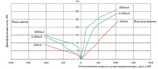Рис 30. Графік залежності демпферної дії амортизаторів від швидкості пересування штока амортизаторів передньої осі.