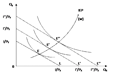 Як пам’ятаємо, гранична норма заміщення благом Х витрат споживача на інші блага означає міру його готовності пожертвувати можливістю витратити бюджет на інші блага задля споживання додаткової одиниці Х, залишаючись на даній кривій байдужості. Якщо припустити, що гранична корисність грошей для споживача залишається незмінною, то його рівновага буде досягатися за умови рівності цінності товару для нього (у грошовій формі) та витрат на його придбання, тобто: Збільшення доходу при фіксованих цінах зміщує бюджетну лінію вправо і робить можливим придбання товарних наборів, які раніше були недоступними. При зниженні доходу – ситуація протилежна. Зсув бюджетної лінії приводить до нової точки рівноваги, тому що при кожному рівні доходу споживач обирає найбільш корисний набір благ. Якщо ми з’єднаємо усі точки рівноваги, які відповідають різним величинам доходу, то отримаємо криву "дохід-споживання" або криву життєвого рівня, як її назвав Дж. Хікс, і яку прийнято обозначати IEP (Income Expansion Path). Лінія " дохід-споживання " – це крива, яка поєднує всі точки оптимуму споживача, що відповідають різним величинам його доходу.