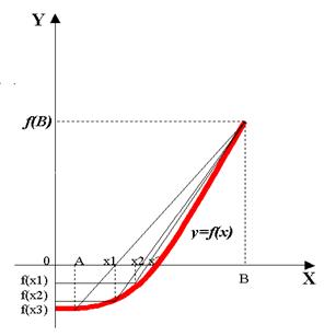 Далі розглянемо відрізки [a, x], [x, b] і виберемо з них той, на кінцях якого функція f(x) має протилежні знаки. Ті ж обчислення виконуємо на вибраному відрізку і отримуємо друге наближення кореня x2 і т.д., поки не отримаємо корінь рівняння (1) із заданою похибкою. Обчислювальна схема методу пропорційних частин реалізовується так. До початку ітераційного процесу задаємо точність e, з якою треба отримати розв’язання, потім: а) приймаємо xl = a; та xr = b; б) на кожному кроці ітераційного процесу обчислюємо наближення до кореня по формулі: x=(xlf(x)- xr f(xr))/(f xr)- f(xl)) (3) в) перевіряємо виконання нерівності ç f (х) ç< e. (4) і якщо нерівність (4) виконується, то x вважаємо розв’язанням рівняння (1), а інакше продовжуємо обчислення; г) перевіряємо умову f (х)× (f(xl) > 0, і при виконанні цієї умови приймаємо xl = x, а інакше xr = x, та повторюємо обчислення з пункту б). Дамо геометричну інтерпретацію методу. Нехай функція f(x) має графік. На кінцях відрізка функція f(x) приймає значення різних знаків. З'єднаємо точки (a, f(a)) та (b, f(b)) прямою, і точку перетину цієї прямої з віссю X приймемо за перше наближення до кореня. Цей процес продовжуємо доти, поки не виконається умова закінчення обчислень. Структурна схема алгоритму відрізняється від структурної схеми попереднього методу лише способом обчислення поточної змінної x..