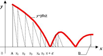 Для розв’язання цієї задачі доцільно використати метод Рибакова. Опишемо обчислювальну схему цього методу. До початку ітераційного процесу задаємо точність e, з якою потрібно отримати корені рівняння (1), і виберемо деяке число m, при умові, що max ç f¢(х) ç< m. Завищення m не порушує збіжності методу, а тільки сповільнює. Потім: 1)вважаємо x0 = a; 2)для кожного k = 1,2… (k - номер ітерації): обчислюємо наближення до кореня по формулі: xk+1 = xk + ç f (х) ç/ m; - перевіряємо умову xk+1 < b, і, якщо умова не виконується, то вважаємо, що всі корені знайдені, інакше продовжуємо обчислення; - перевіряємо виконання умови ç xk+1 - xk,ç> e, і якщо вона виконується, то повторюємо обчислення з новим k; а інакше вважаємо xk+1 одним із коренів рівняння і продовжуємо обчислення; 3) обчислюємо початкове наближення до наступного кореня по формулі x0 = xk+1 +e і переходимо до п.2)