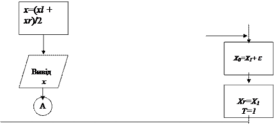 Точку перетину цією прямою з віссю X приймаємо за друге наближення до першого кореня і т.д., поки не отримаємо корінь. Відступивши від отриманого праворуч на e, приступаємо до знаходження наступного кореня. Тут змінна T (прапорець) приймає значення 1 після першого виконання умови ç xk+-xk,ç£ e,. При цьому допоміжні змінні xl та xr запам'ятовують значення xk+1. Значення x=(xl + xr)/2 буде надруковано, якщо при новому значенні xk+1 не виконується вказана раніше умова. Інакше знову змінюється допоміжна змінна xr (набуває нового значення xk+1), а xl зберігає своє значення і знову обчислюється нове значення xk+1.