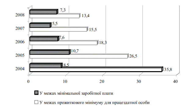 Відтак, незважаючи на прогрес, що реєструється у рівнях соціальних стандартів – мінімальної заробітної плати та прожиткового мінімуму для працездатної особи – частка населення, заробітна плата якого є меншою прожиткового мінімуму, хоча й скоротилася, проте становила наприкінці 2008 р. 13,4 %. Кількість громадян, які отримували зарплату, меншу рівня мінімальної заробітної плати, складала 5,2 % (рис. 3.2.2.). І лише 32,7 % населення одержували заробітну плату понад 2000 грн. Оскільки не всі підприємства мають необхідні для цього фінансові можливості, то у 2005 році зростала заборгованість з виплати заробітної плати. Станом на початок 2006 року заборгованість з виплати заробітної плати становила по Україні 959,7 млн. грн. Заборгованість із виплати заробітної плати становила на кінець 2007 року 745,1 млн. грн., з яких 40% – заборгованість, накопичена економічно активними підприємствами (найбільші боржники – підприємства Донецької, Луганської, Харківської областей, сумарна заборгованість яких склала 43,2% від усієї заборгованості по Україні).