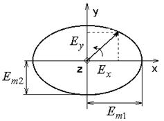 1. Равна нулю одна из составляющих или сдвиг фаз между ними равен нулю. Тогда конец вектора Е перемещается вдоль линии произвольно, в общем случае, ориентированной относительно системы координат. Волна – линейно поляризованная. 2. Равны амплитуды Еm1 = Еm2, а сдвиг фаз - 90°. Тогда кривая окружность, волну называют волной с круговой поляризацией. Легко заметить, что суперпозиция двух волн с линейными поляризациями, сдвинутых по фазе и пространственно на 90°, дают эллиптически поляризованную волну, две волны с круговыми поляризациями и противоположными направлениями вращения в результате суперпозиции дают волну линейно поляризованную. Если рассматривать волну, распространяющуюся в направлении, не совпадающем с осью системы координат, то вместо пропорциональности