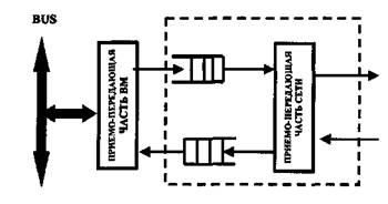 —адаптеров, осуществляющих интерфейс между ВМ и сетью передачи пакетов; —коммутаторов сети передачи пакетов; —кабелей, служащих для подсоединения входных и выходных каналов (линков) адаптеров к портам коммутатора и соединения коммутаторов друг с другом для оборудования необходимого числа портов и заданной конфигурации сети. 2. Адаптеры состоят из двух частей: приемопередающей части ВМ и приемопередающей части сети, между которыми, как правило, имеется согласующий буфер, например входная и выходная FIFO очереди, показанные на следующем рисунке.