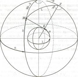 т = -2,5\!>Е + с, где Е — освещенность, -2,5 — шаг шкалы звездных величин; с -постоянная величина, нулытункт шкалы. Для Солнца т = -26,78, доя Луны т = -12,71, самая яркая звезда Сириус имеет звездную величину -1,46, глаз человека различает звезды до 6 — 7™. Самые мощные телескопы путем накопления световой энергии на фотослое позволяют регистрировать звезды до 23т. Во всех развитых странах издаются на несколько лет вперед таблицы координат звезд. В России Институтом теоретической астрономии (Санкт-Петербург) издается «Астрономический ежегодник» (АЕ), содержащий координаты 695 звезд ярче 4,5т. Задачи по определению астрономических координат ср и Я, обычно решаются раздельно. Астрономическая широта <р в общем случае может быть найдена из решения параллактического треугольника М2Р (рис. 5.2) по формулам: