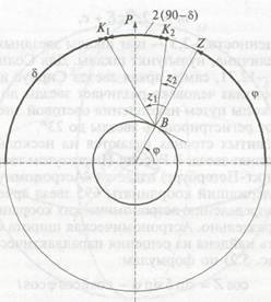 В — точка наблюдения; Р — полюс мира; 2 — точка зенита; К}, Кг — кульминации Полярной звезды; ср — широта точки наблюдения; 5 — склонение Полярной звезды; гь ф — зенитные расстояния К\ и К2 При измерении зенитных расстояний применяют первую формулу, этот способ нахождения широты называют зенитальным. Второй путь — измерение астрономического азимута А светила М и решение второго уравнения относительно <р, этот способ называют азимутальным. В зависимости от абсолютного значения широты и имеющихся инструментов применяются различные частные варианты обоих способов. Наиболее прост вариант наблюдений близполюсной звезды (например, Полярной звезды) в двух кульминациях (К^ и К2, рис. 5.3) в плоскости меридиана точки наблюдения В, когда часовой угол ( равен 0 и 180°: 2! + ф + 8 = 180°; 22 + ф + 90° - 8 = 90°. Откуда Ф = 180° - 8 - 21, Ф = 8 - 22. Складывая почленно, получим 2ф = 180° - 21 - 2ъ Ф = 90° - (21 +