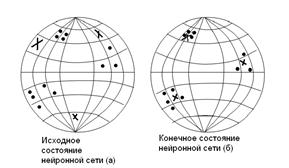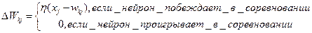 Тогда обучение нейрона к состоит в смещении синоптических весов от неактивных к активным входным нейронам. Если нейрон к не формирует отклика на конкретный входной образ, то он и не обучается. Когда некоторый нейрон выигрывает в конкурентной борьбе, веса связи этого нейрона равномерно распределяются между его активными входными нейронами, а связи с не активными входными нейронами ослабляются. Следствием такой конкуренции становится самоорганизация процесса обучения. Нейроны уточняют свои синоптические веса так, что при предъявлении группы близких по значениям входных векторов, победителем становится один и тот же нейрон. Согласно правилу конкурентного обучения изменения дельта Wkj