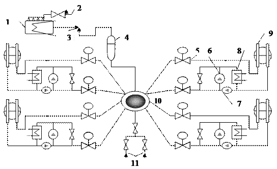 Каждая из четырех циркуляционных петель (на реакторе ВВЭР-440 – шесть петли) включает ГЦН 7, горизонтальный парогенератор 9, две главные запорные задвижки 5 с электроприводами, паровой компенсатор давления 4 (объема) с электроподогревателем и собственно реактор 10 с системой подачи подпиточной воды. Рисунок 1. Схема первого контура АЭС с реактором ВВЭР-1000 1 – барботажный бак; 2 – предохранительный клапан; 3 – регулятор; 4 – компенсатор давления; 5 – главная запорная задвижка; 6 – вспомогательный насос; 7 – ГЦН; 8 – теплообменник контура охлаждения подшипника ГЦН; 9 – парогенератор; 10 – реактор; 11 – вход для подпиточной воды в реактор 1. Требования к водно - химическому режиму первого контура.