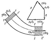 За время dt этот участок переместится в положение, определяемое сечениями 1'-1' и 2'-2'. Чтобы выразить приращение количества движения рассматриваемого участка, нужно из количества движения объема между сечениями 1-1 и 2-2 вычесть количество движения объема между сечениями 1’-1’ и 2'-2'. При вычитании количество движения промежуточного объема, ограниченного сечениями 1'-1’ и 2-2, сократится и останется лишь разность количеств движения элементов 2-2' и 1-1', которые на рис. 8.1 заштрихованы. Объемы этих элементов Это приращение количества движения обусловлено импульсом всех внешних сил, действующих на объем жидкости между сечениями 1-1 и 2-2, - сил давления в первом и втором сечениях
