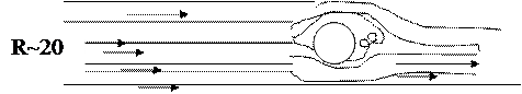 При R ~ 1 начинают появляться завихрения за цилиндром. При R ~ 20 образуются два завихрения.