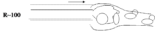 При R ~ 100 завихрения плывут вниз по течению, отрываясь от цилиндра.