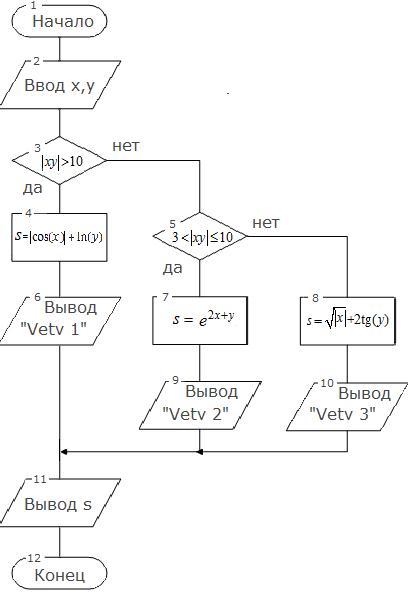 f_xy=fabs(x*y); if (f_xy>10) { // s=fabs(cos(x))+log(y); cout <<"\nVetv 1\n"; } else if (f_xy>3 && f_xy<=10) // { s=exp(2*x+y); cout <<"\nVetv 2\n"; }