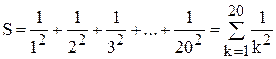 Одной из важных задач, решаемых с помощью циклического алгоритма – вычисление суммы большого числа слагаемых. Пример 4.15. Вычислить сумму Для решения данной задачи воспользуемся методом накопления суммы. Суть его состоит в следующем. Положим S = 0 – это начальное значение S, когда вычисление суммы еще не начато. Далее вычислим следующее выражение: S + S:= S + 1/sqr(1); После выполнения этой операции значение S будет равно 1, т.е. первому слагаемому. Теперь вычислим выражение: S + S:= S + 1/sqr(2); При выполнении этой операции к старому значению S = 1 прибавится второе слагаемое, и результат запишется в S. После выполнения этой операции значение S будет равно Аналогично, после выполнения оператора S:= S + 1/sqr(3); мы получим сумму 3-х слагаемых, и т.д. Для вычисления всей суммы надо 20 раз повторить следующий оператор S:= S + 1/sqr(k); увеличивая при этом каждый раз значение k на 1. Окончательно получаем следующий алгоритм: 1. Положить S = 0, k = 1. 2. Вычислить S + 3. Увеличить k на 1. 4. Если k £ 20, повторить шаг 2, иначе СТОП. На PASCAL этот алгоритм удобно записать с помощью цикла repeat, т.к. в данном варианте алгоритма проверка условия прекращения цикла происходит после выполнения действия. var S: real; k: integer;